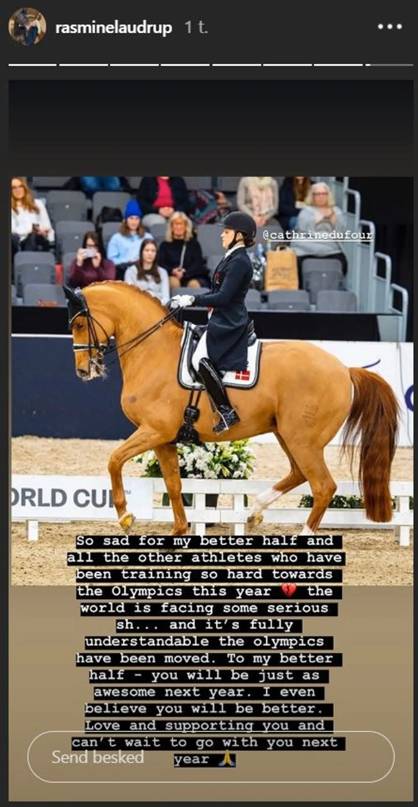 »Så ked af det på min bedre halvdels vegne og til alle de andre atleter, som havde trænet så hårdt frem mod årets OL,« skriver hun på sin Instagram-story og fortsætter: