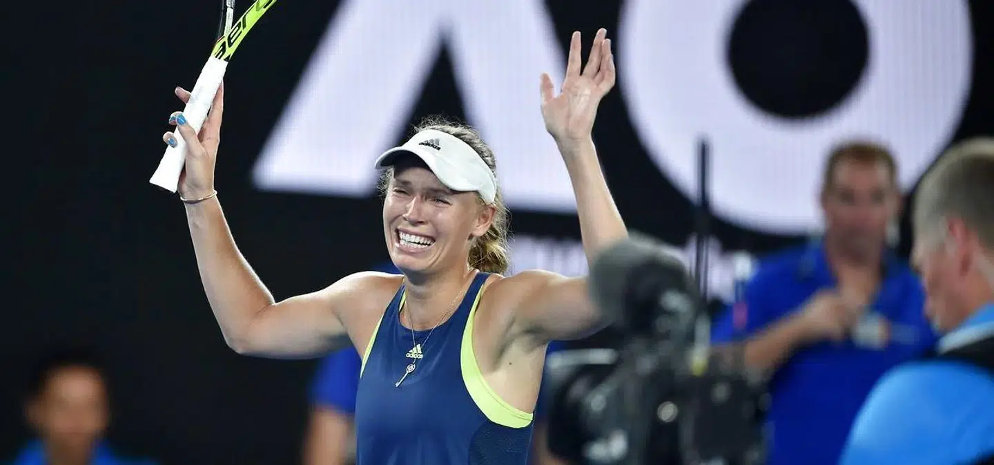En stegende hed januaraften i 2018 i Melbourne vandt Caroline Wozniacki endelige sin Grand Slam. Med 7-6, 3-6, 6-4 slog Wozniacki rumæneren Simona Halep, og straks smed den danske tennisspiller sig ned på Rod Laver Arenas blå underlag. Der jublede hun som aldrig før.
