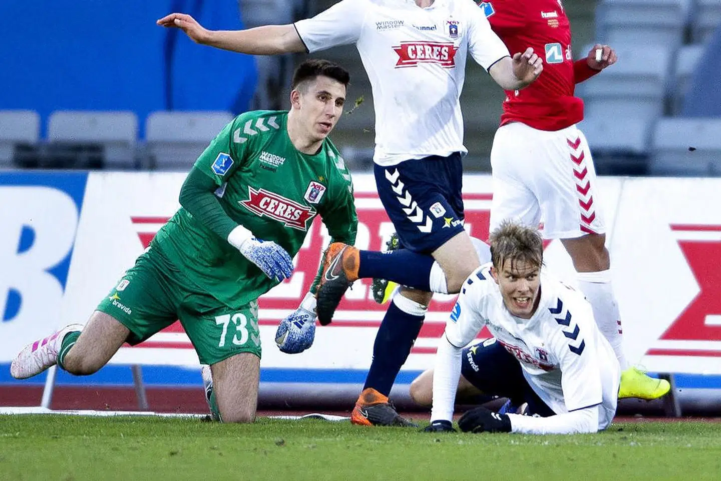 Få minutter senere skabte Grabara nok en farlig situation ved helt upresset at sende en håbløs aflevering lige i fødderne på en modstander. Det var derfor, Frederik Tingager med en rasende attitude vendte sig mod sin målmand: 'Nu kommer du f..... i gang!'