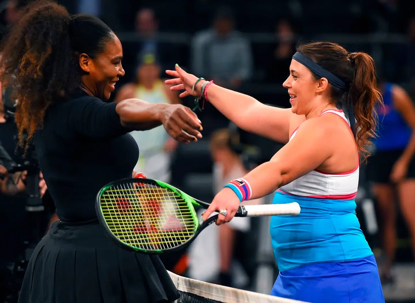 Serena Williams hilser på Marion Bartoli, der også netop er vendt tilbage efter en lang pause, ved Tie Break Tens i New York: