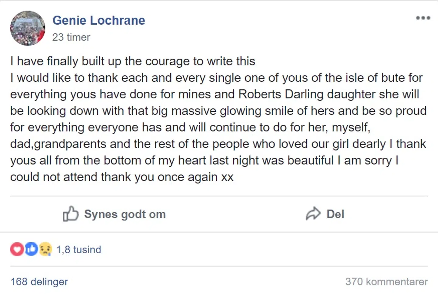 ’Jeg har endelig opbygget nok mod til at skrive dette. Jeg vil gerne takke hver eneste af jer, der bor på Bute, for alt, hvad I har gjort for min og Robert Darlings (Alesha MacPhail far, red.) datter. Hun vil kigge ned og være meget stolt med et stort smil på sine læber for alt, som I alle har gjort og stadig gør for mig, hendes far, bedsteforældre og alle andre, der elskede vores lille pige. Jeg takker jer alle af hele mit hjerte. Sidste aften var smuk, undskyld jeg ikke kunne komme (til mindehøjtidligheden, red.) Tak igen alle sammen,’ skriver den knuste mor, Georgina Lochrane.
