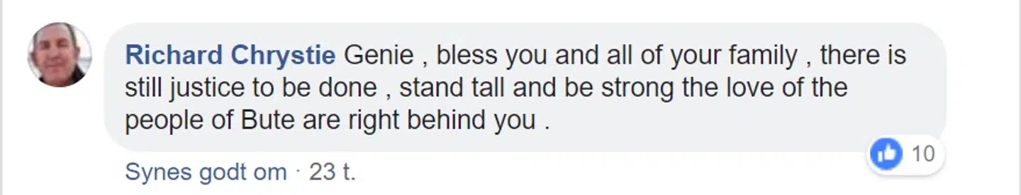 ’Genie, Gud velsigne dig og hele din familie, der er stadig retfærdighed, den skal ske fyldest, forbliv oprejst og vær stærk, kærligheden fra Bute-beboerne er lige bag dig,’ skriver Richard Chrystie.