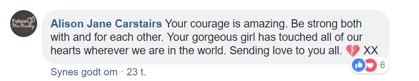 ’Dit mod er fantastisk. Vær stærk både med og for hinanden. Din smukke pige har rørt alle vores hjerter, hvor end vi er i verden. Sender kærlighed til jer alle,’ skriver Alison Jane Carstairs.