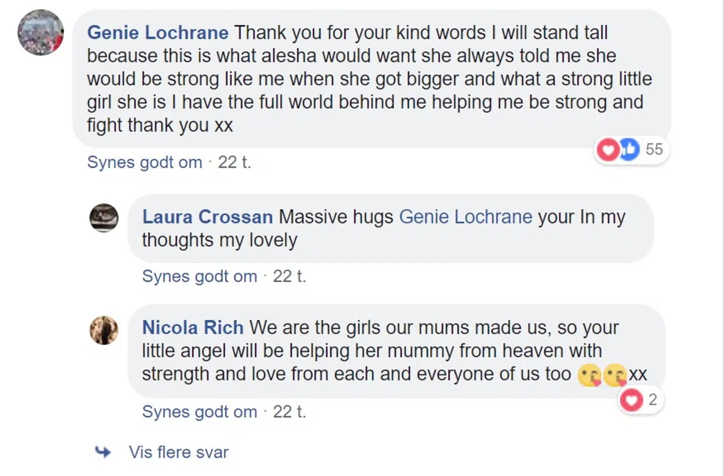 ’Tal for alle de pæne ord. Jeg vil stå oprejst, fordi det er, hvad Alesha ville have. Hun har altid fortalt mig, at hun ville være stærk som mig, når hun blev ældre. Og hvilken stærk lige pige, hun er. Jeg har hele verden bag mig, der hjælper mig med at være stærk og kæmpe. Tak,’ skrev den ødelagte mor.