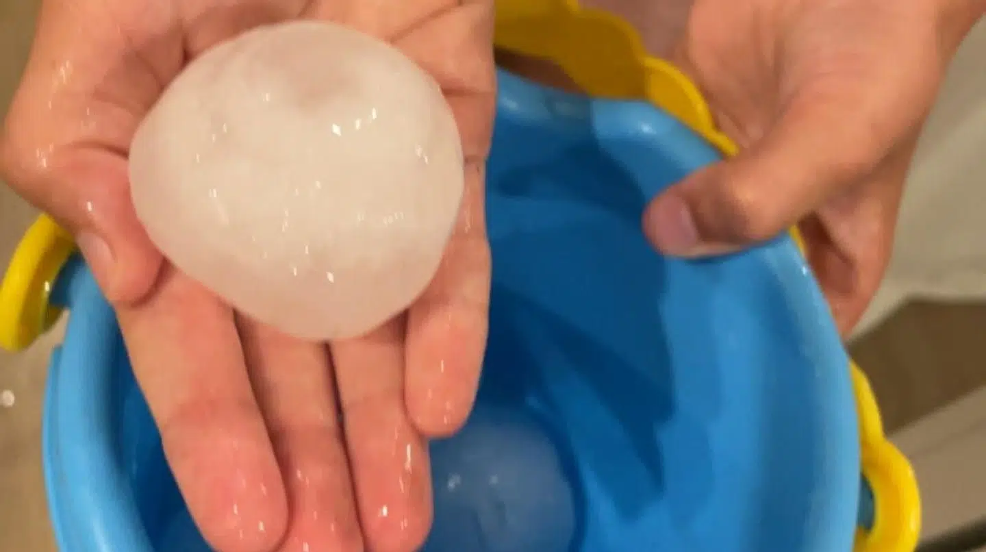 Hun fortæller, at hun også kun har fået et par timers søvn efter den ubehagelige oplevelse, som har efterladt store haglklumper på jorden, som klokken seks i morges endnu var store – på trods af varmen i området.