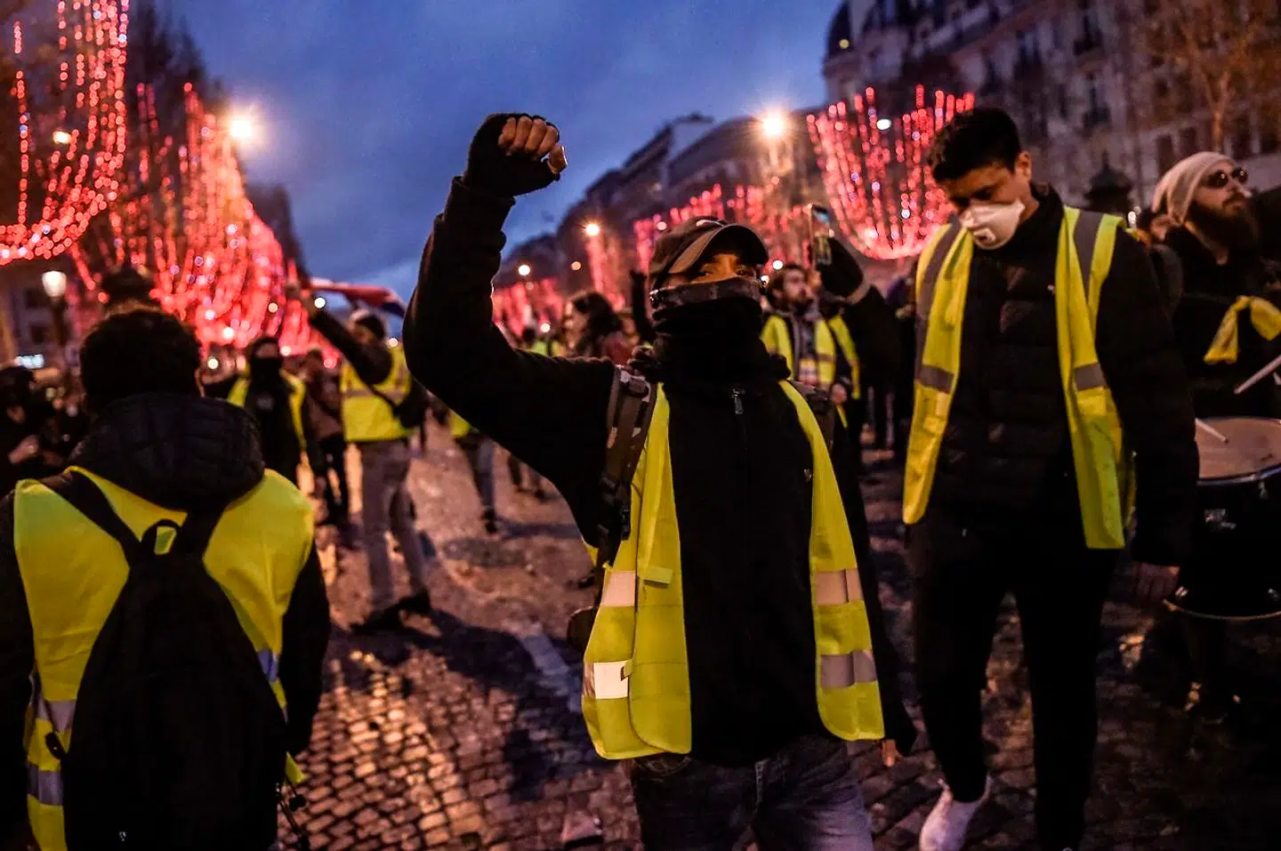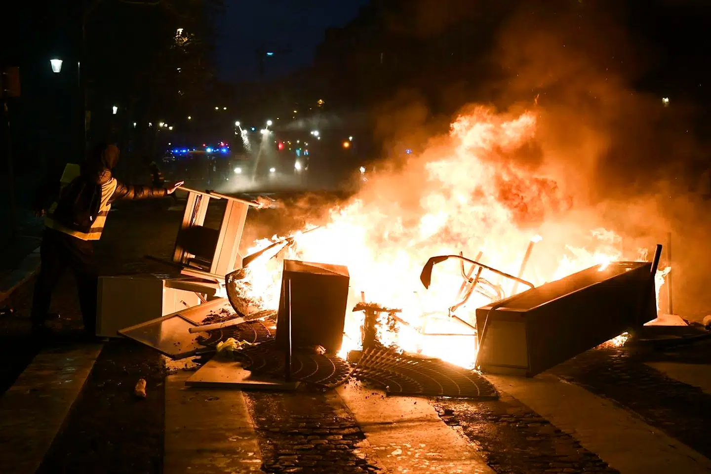 Mens mørket sænker sig over byen, og julelysene tændes på Champs-Élysses, flyttes optøjerne ud til de mindre gader, hvor biler brændes, og butikker plyndres.