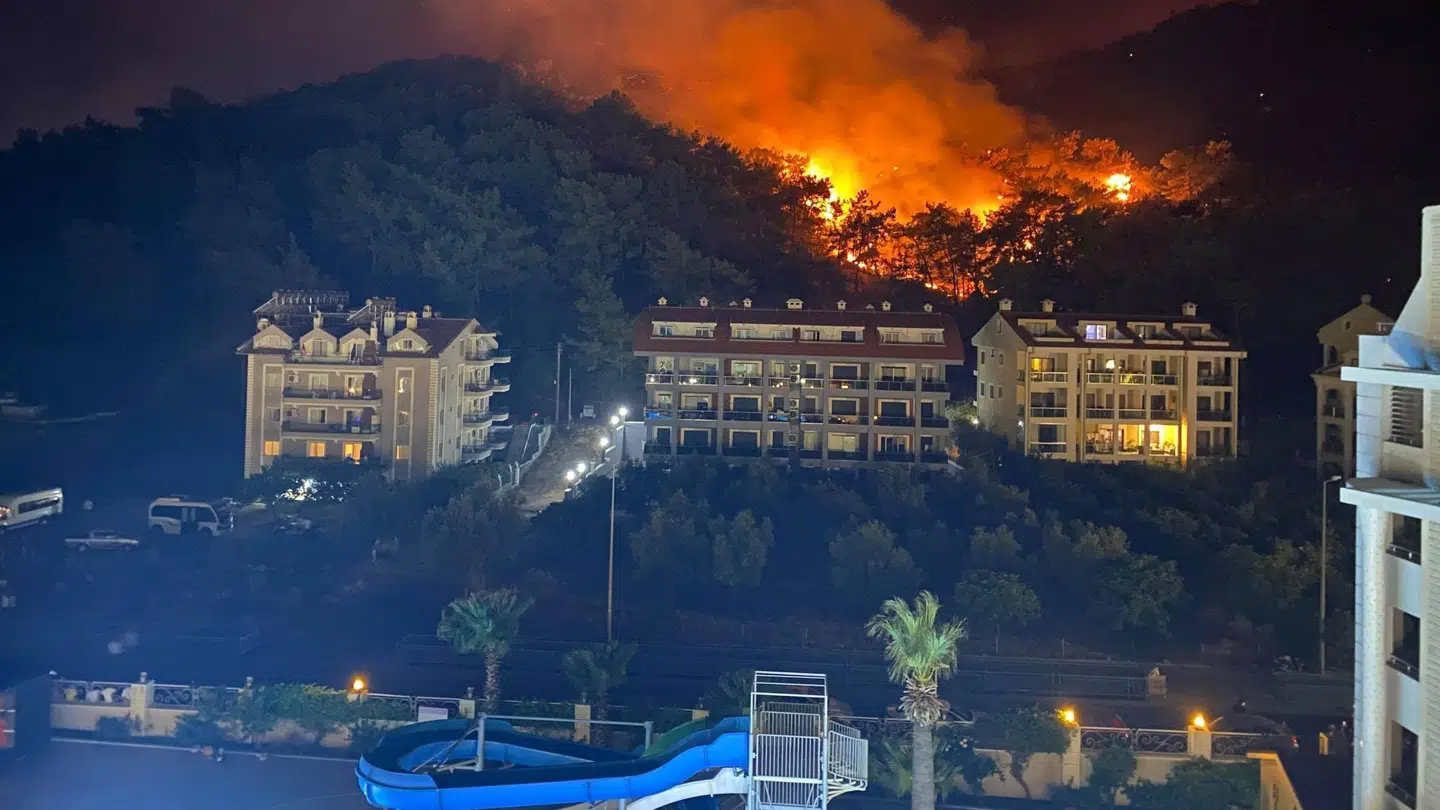 Den massive røgsky bevægede sig fra det tyrkiske bjerge og ind over Rhodos. Det skyldes, at den tyrkiske sydkyst lige nu er ramt af voldsomme skovbrande.