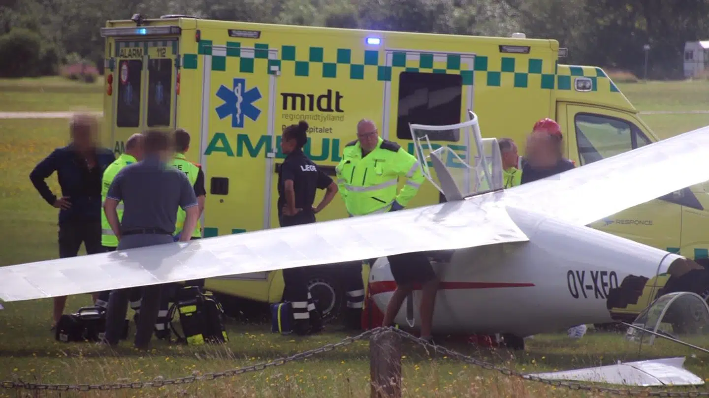 Der er tale om et lille svævefly med to personer om bord, som er havareret ved landingsbanen og ramt den nærliggende mark.