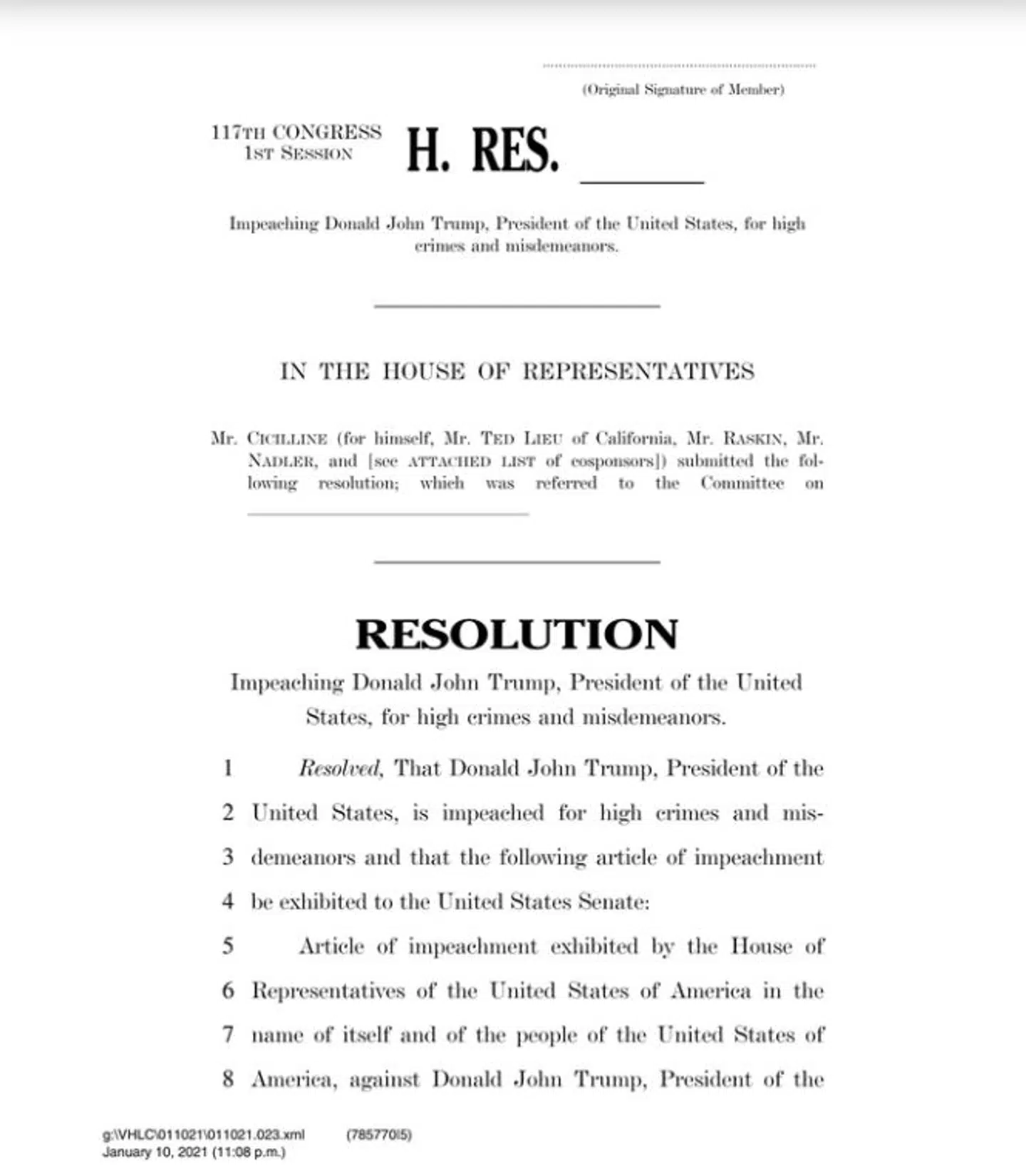 Demokraterne i Repræsentanternes Hus i Kongressen har nu taget det første officielle skridt til at indlede en rigsretssag mod afgående præsident Donald Trump.