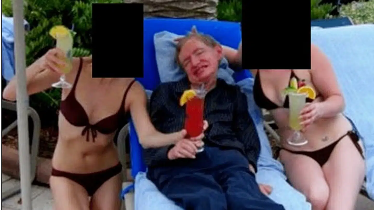Halvliggende mellem to kvinder i bikini dukker den afdøde professor Stephen Hawking nu op på et foto fra de offentliggjorte Epstein-filer.