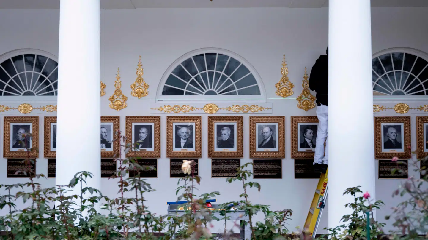 Sådan beskriver podcastværten, Joe Rogan, de skilte, som præsident Donald Trump har opsat under portrætterne af sine forgængere i Det Hvide Hus.