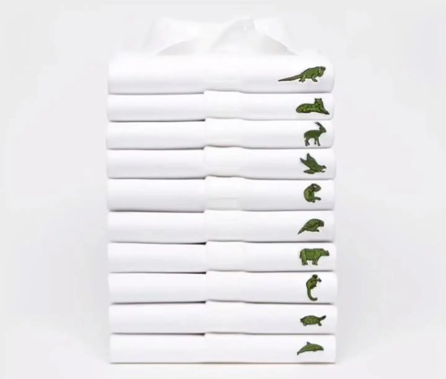 I stedet for krokodille-logoet, der normalt er placeret til venstre på modehusets trøjer, findes nu eksempelvis golfmarsvinet, en burmesiske skildpadde (Batagur trivittata, red), samt Sumatra-tigeren.