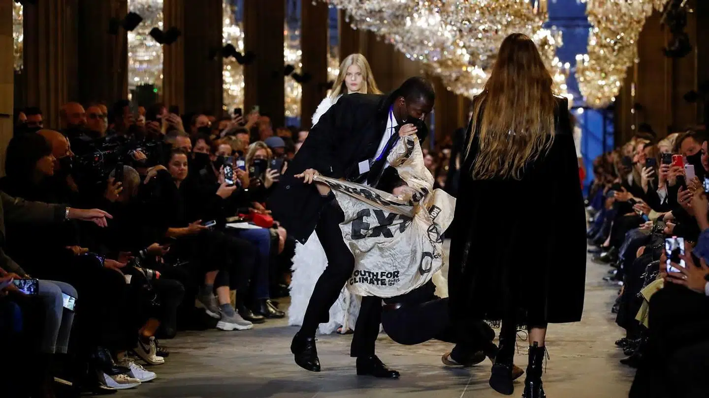 Showet blev forstyrret, da en kvindelig klimaaktivist fra gruppen Extinction Rebellion gik ind på catwalken og fremviste et banner med teksten "overconsumption = extinction" (overforbrug = udryddelse på dansk, red.).