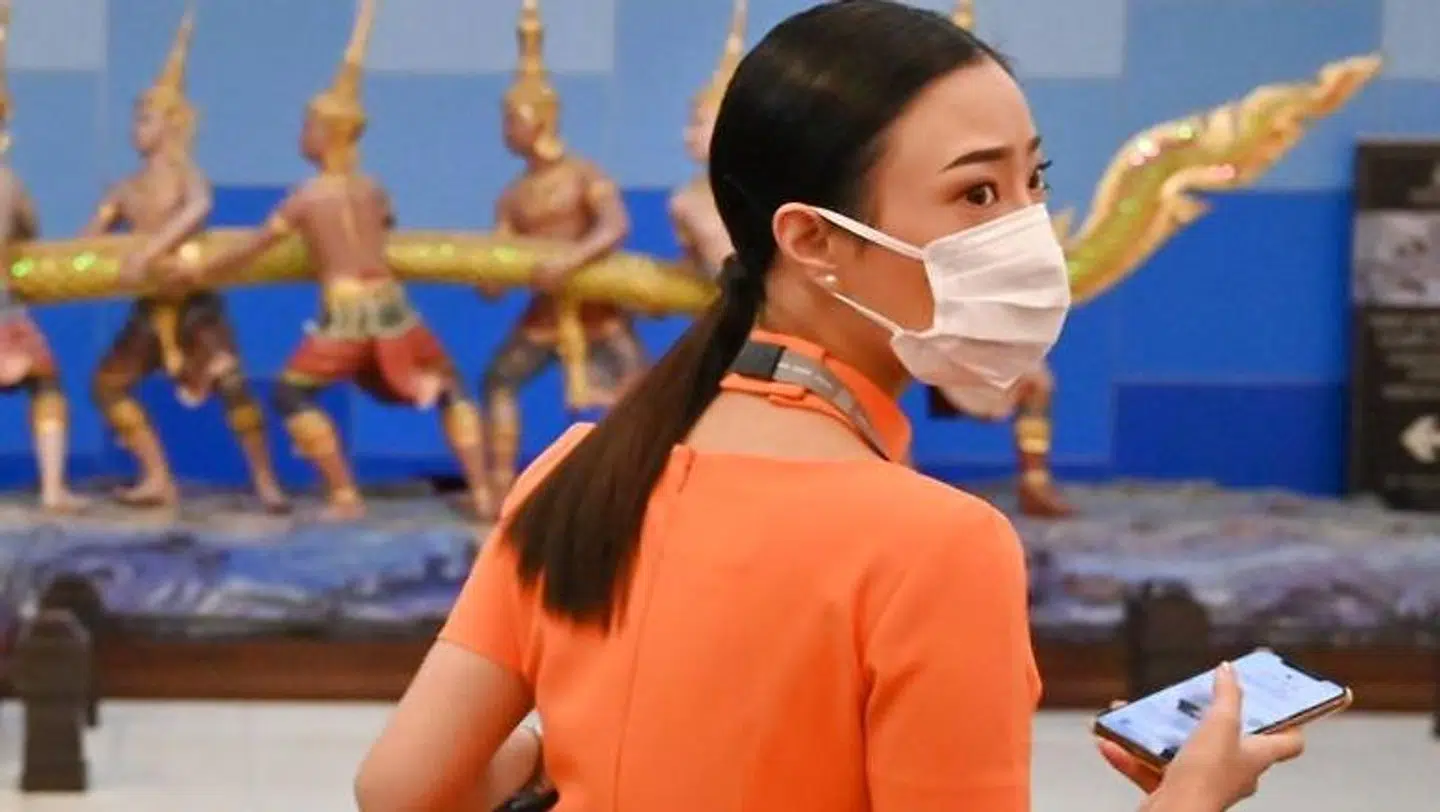 Ud over en stor gruppe asiatiske turister, er der kun en enkelt passager, som bærer ansigtsmaske.
