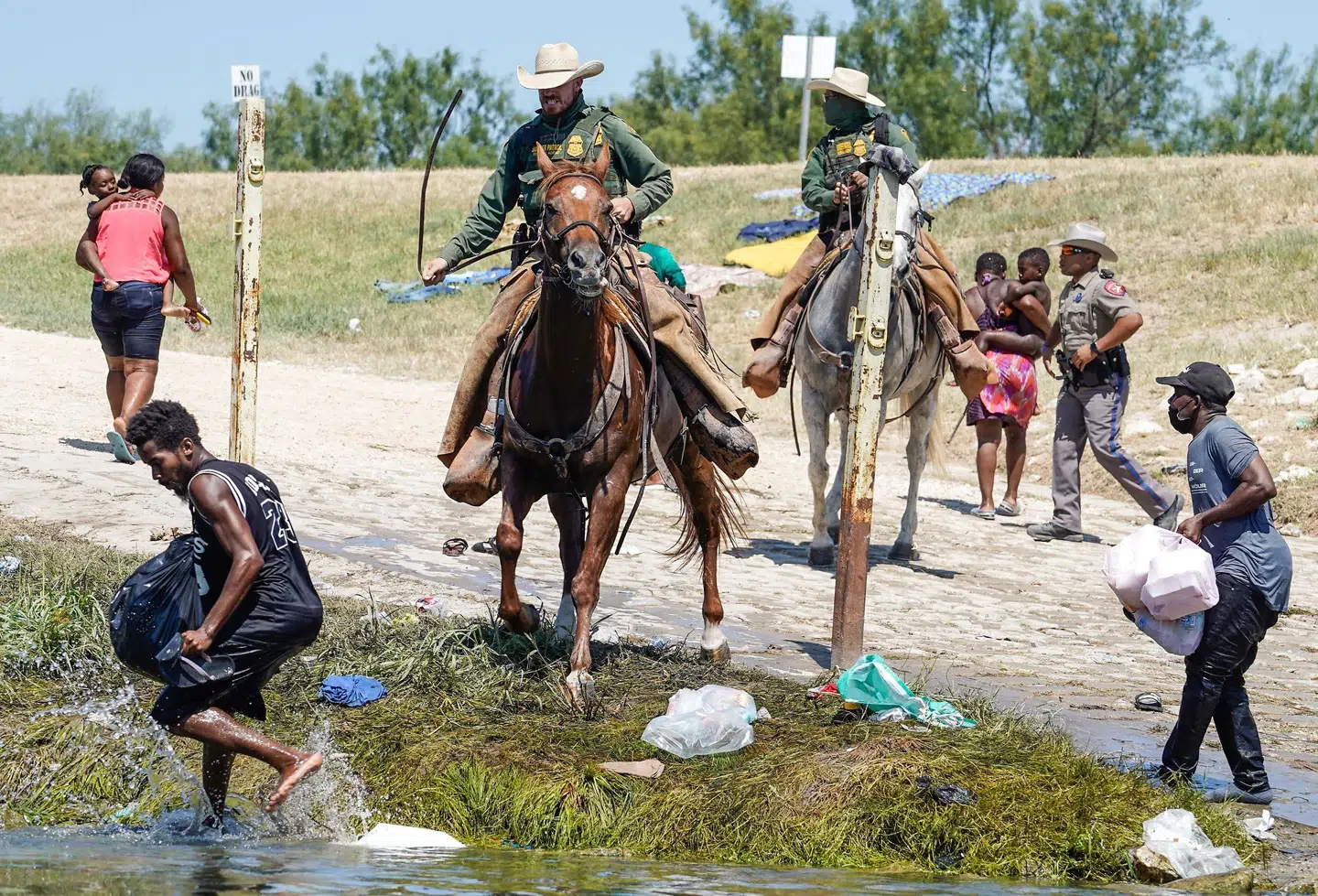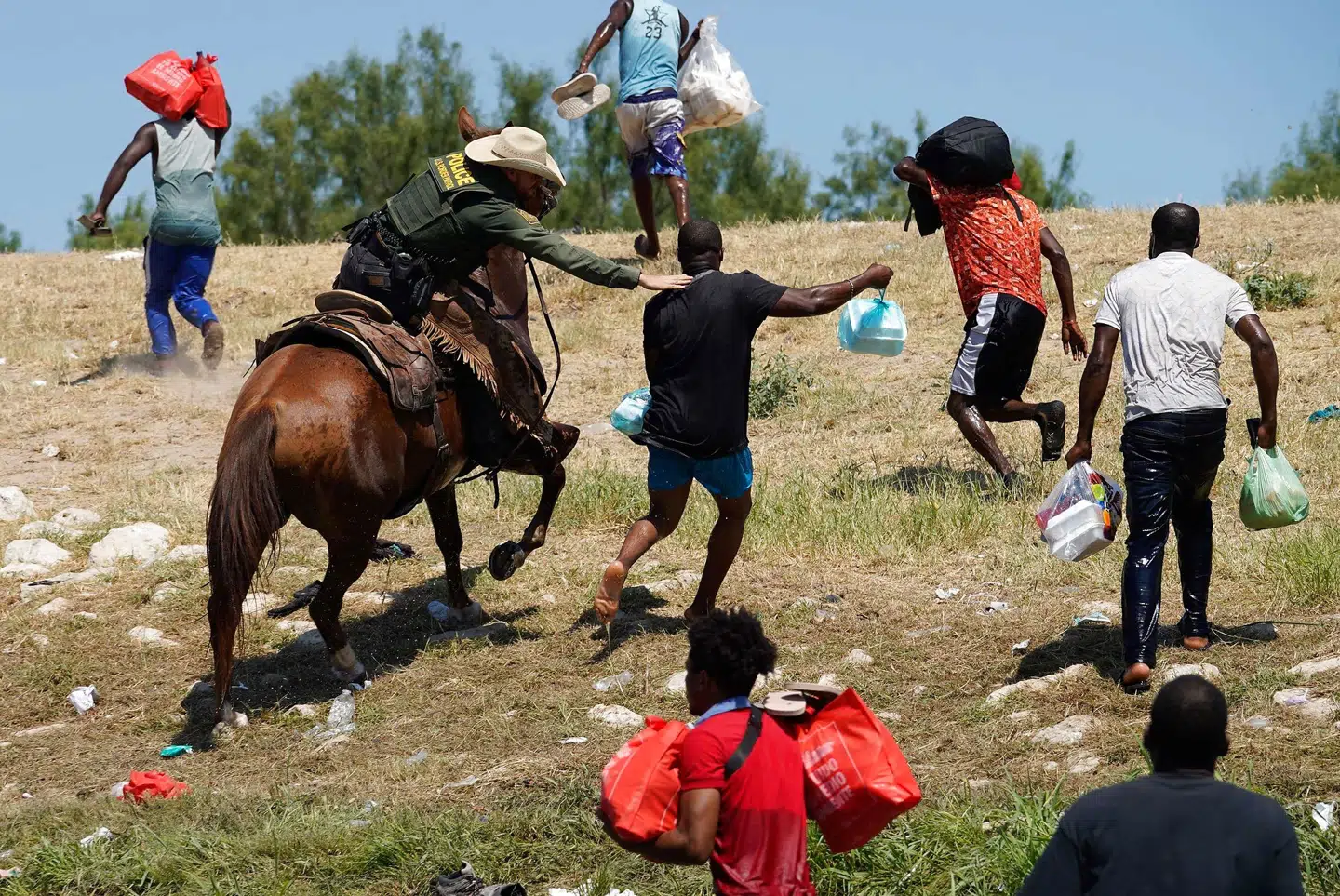 Herpå kunne man se en amerikansk grænsevagter på en hest forsøge at stoppe migranter fra Haiti ved floden Rio Grande i Texas. Og det kunne ikke mindst se ud til, at betjenten brugte tøjlerne som pisk over for de løbende haitianere. Det var dette billede: