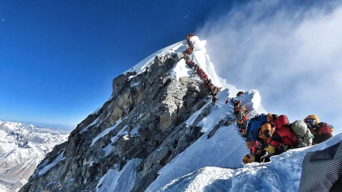Billedet er taget af den canadiske bjergbestiger og filmmand Elia Saikaly, der i sidste uge stod på toppen af det 8848 meter høje bjerg. På vej ned har han taget nogle voldsomme oplevelser med sig.