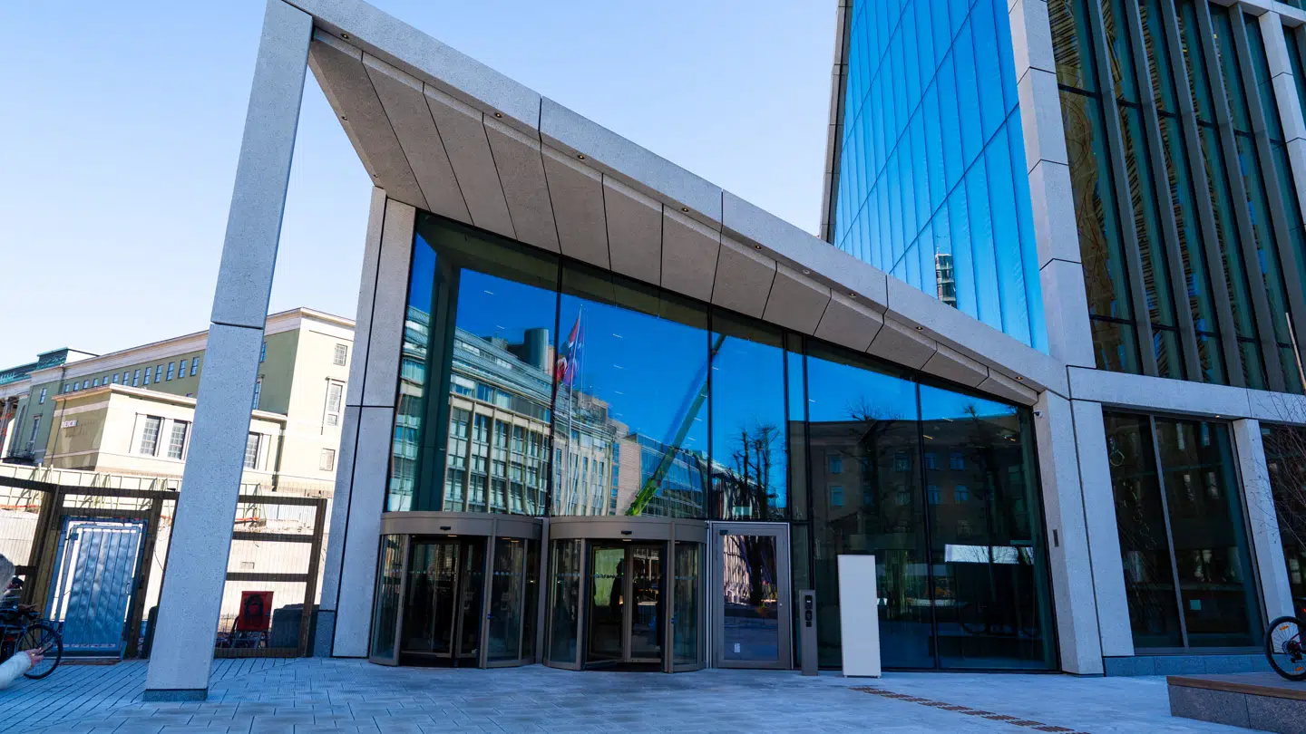 Bomberydderee er mandag morgen til stede ved de nye regeringsbygninger i Oslo, der skal indvies senere på dagen.