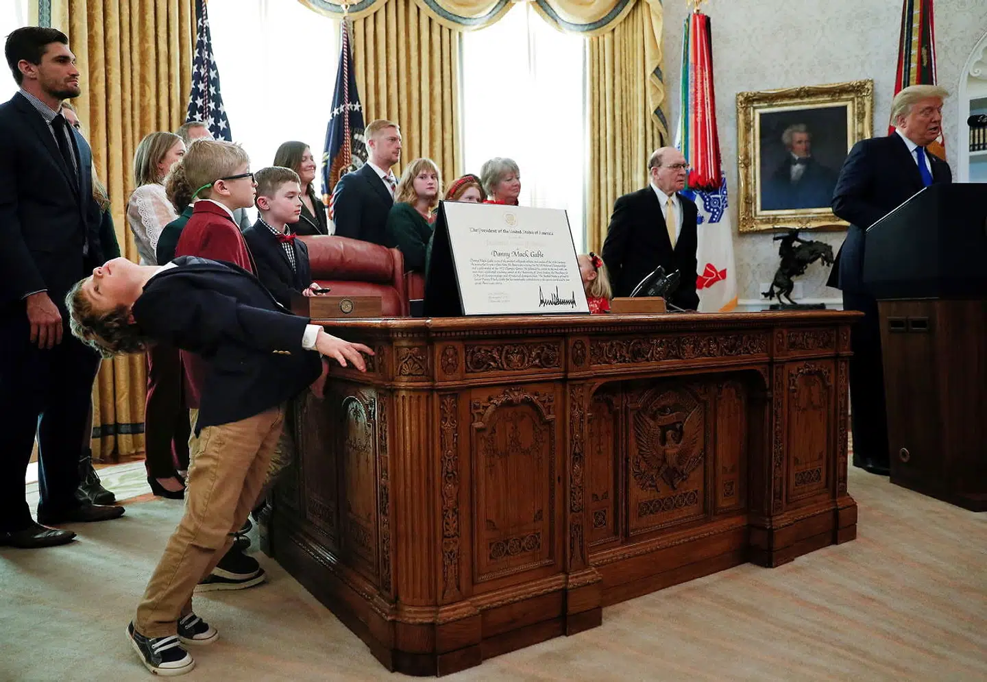 Stedet er Det Ovale Værelse i Det Hvide Hus, og bordet, som drengen læner sig op ad, er det 140 år gamle 'Resolute desk', som dronning Victoria forærede den amerikanske præsident tilbage i 1880.