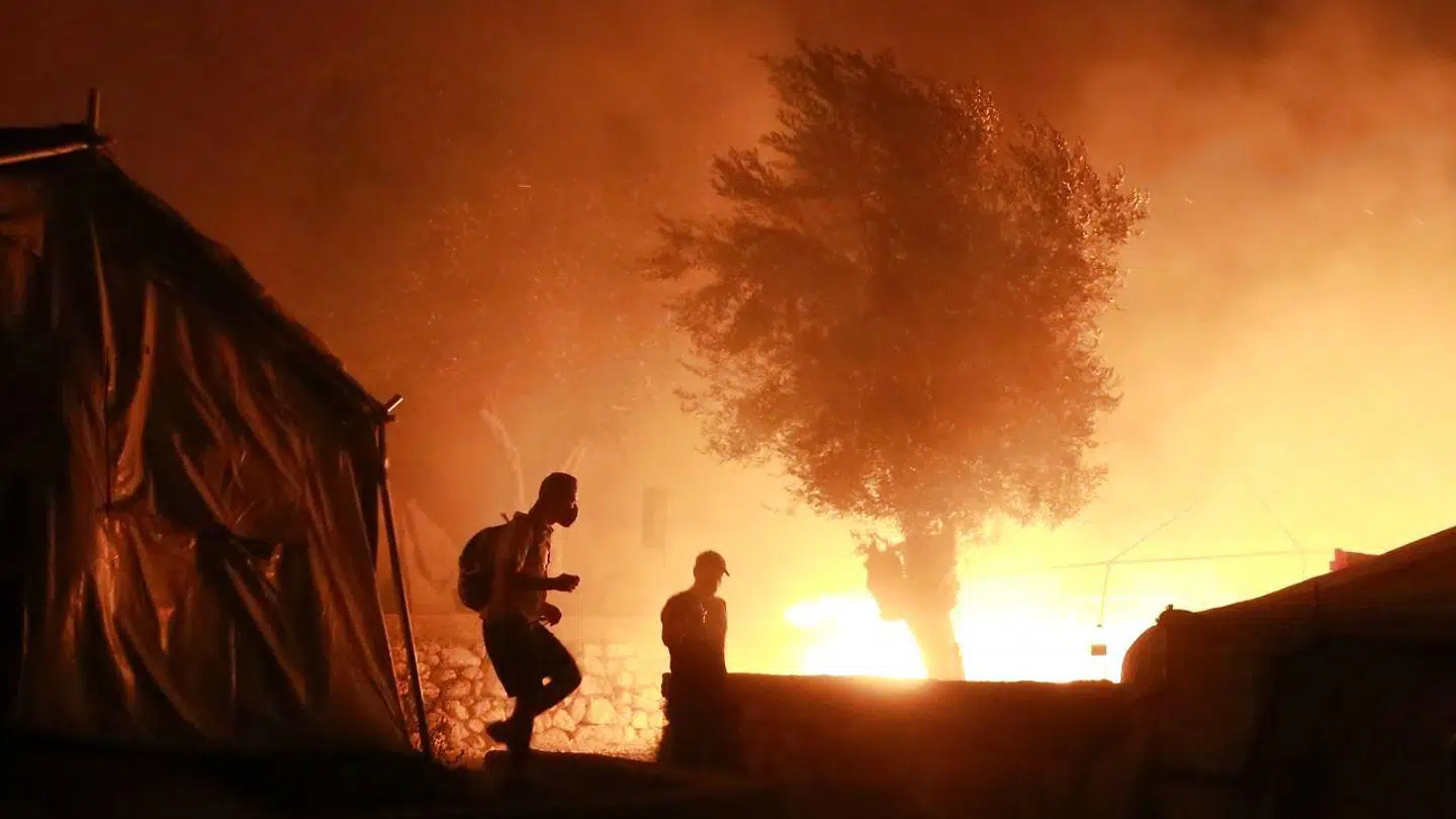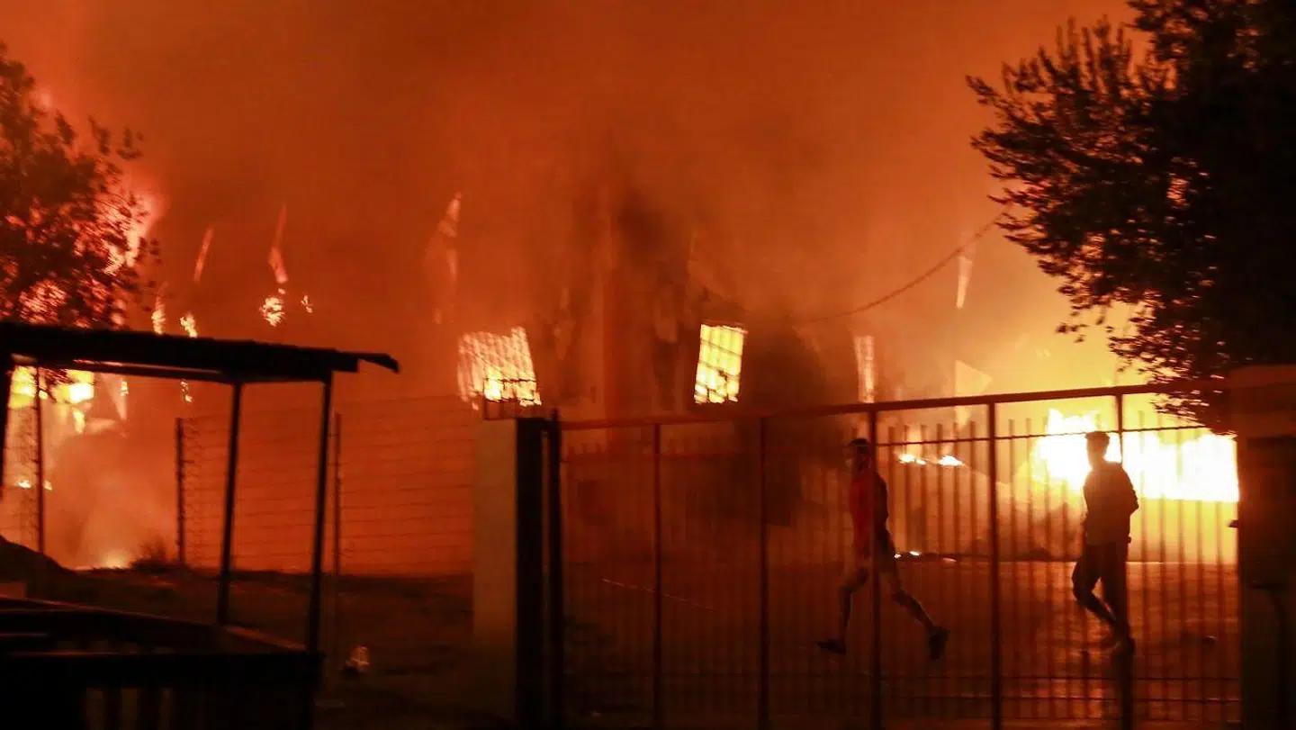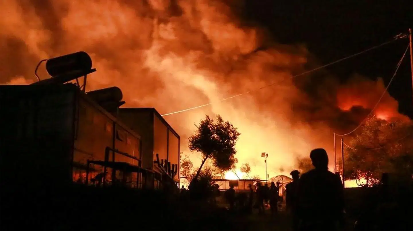 Den kæmpestore flygtningelejr Moria på den græske ø Lesbos står i flammer, efter at flere brande brød ud natten til onsdag