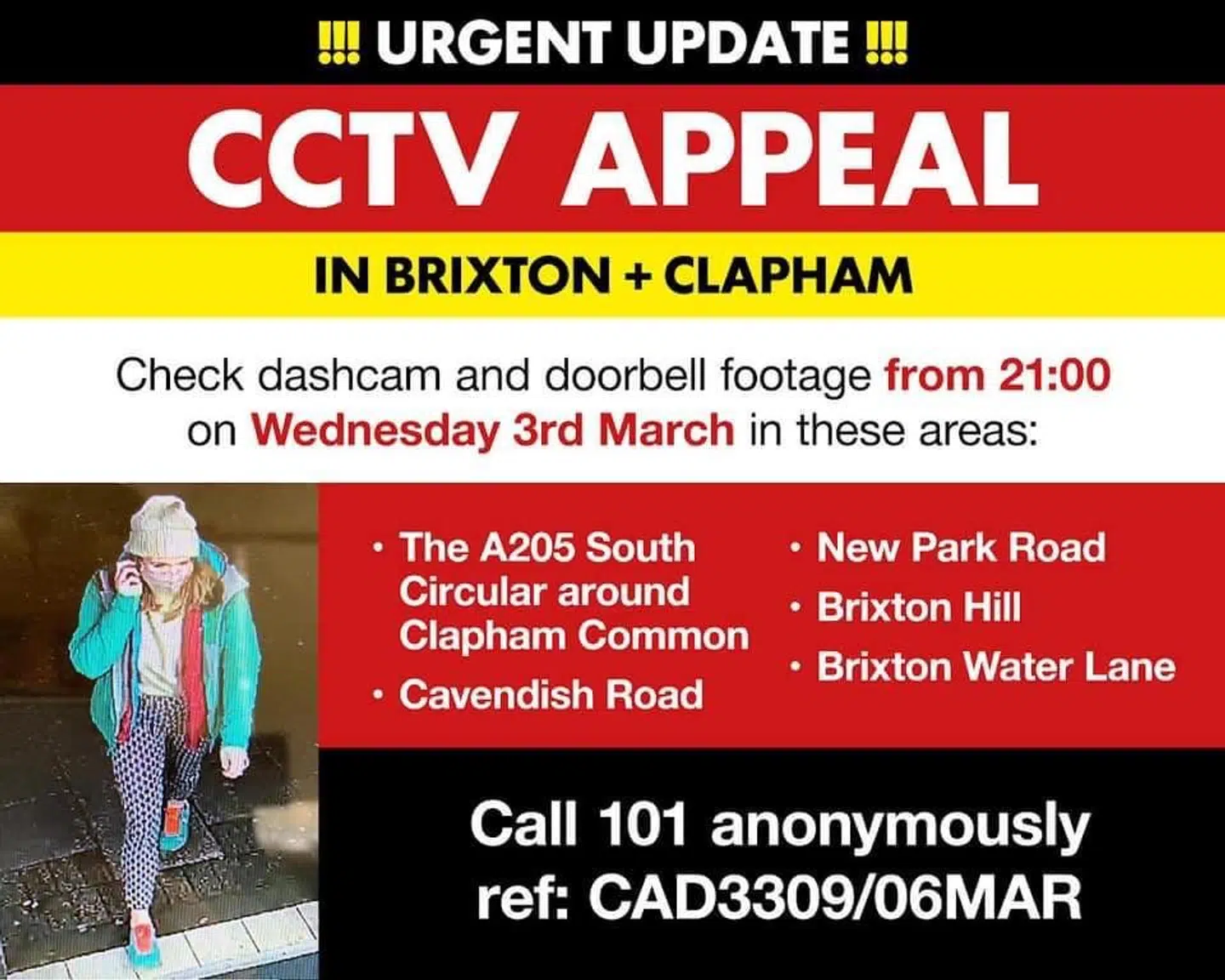 De sidste sikre livstegn fra hende – bortset fra samtalen med kæresten – er et billede fra dørtelefonen i en opgang på ruten, samt et signal fra hendes telefon, som en mast i Clapham har opfanget.