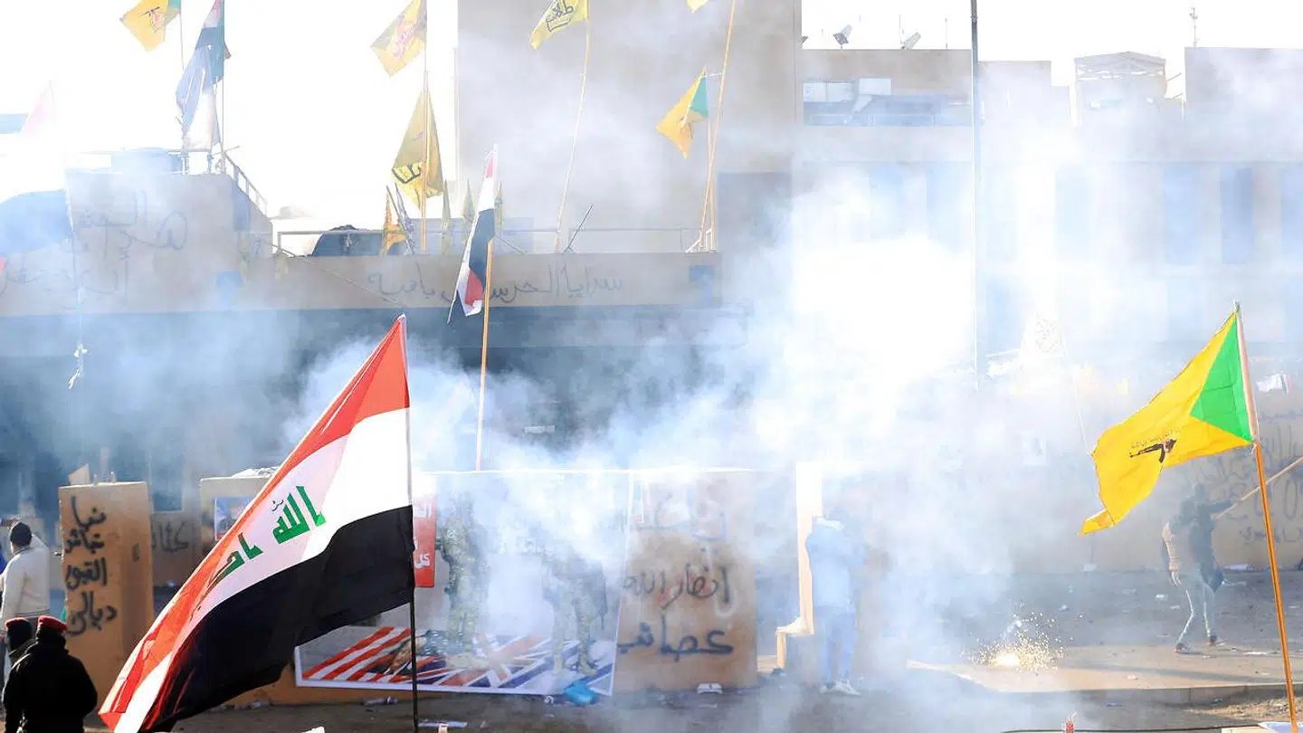 Tilhængere af iranskstøttede paramilitære grupper stormede tirsdag USA's ambassade i Bagdad.