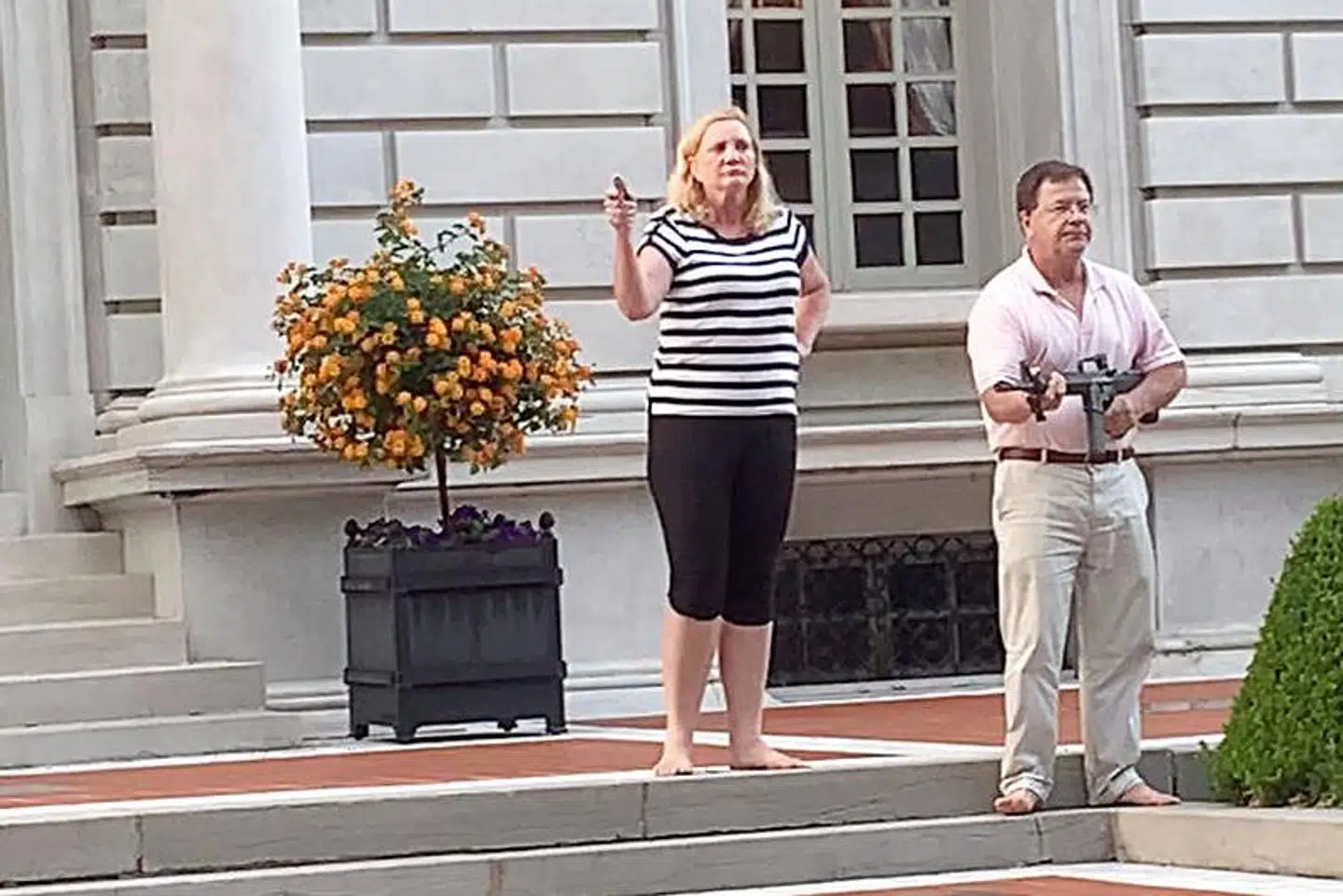 På et tidspunkt sigtede ægteparret - i tilsyneladende forvirring - også på hinanden. Og mindst én gang lod den capri-klædte husejerinde til at snuble, mens hun med pistolen i skudposition tog nogle hurtige skridt hen imod demonstranterne.