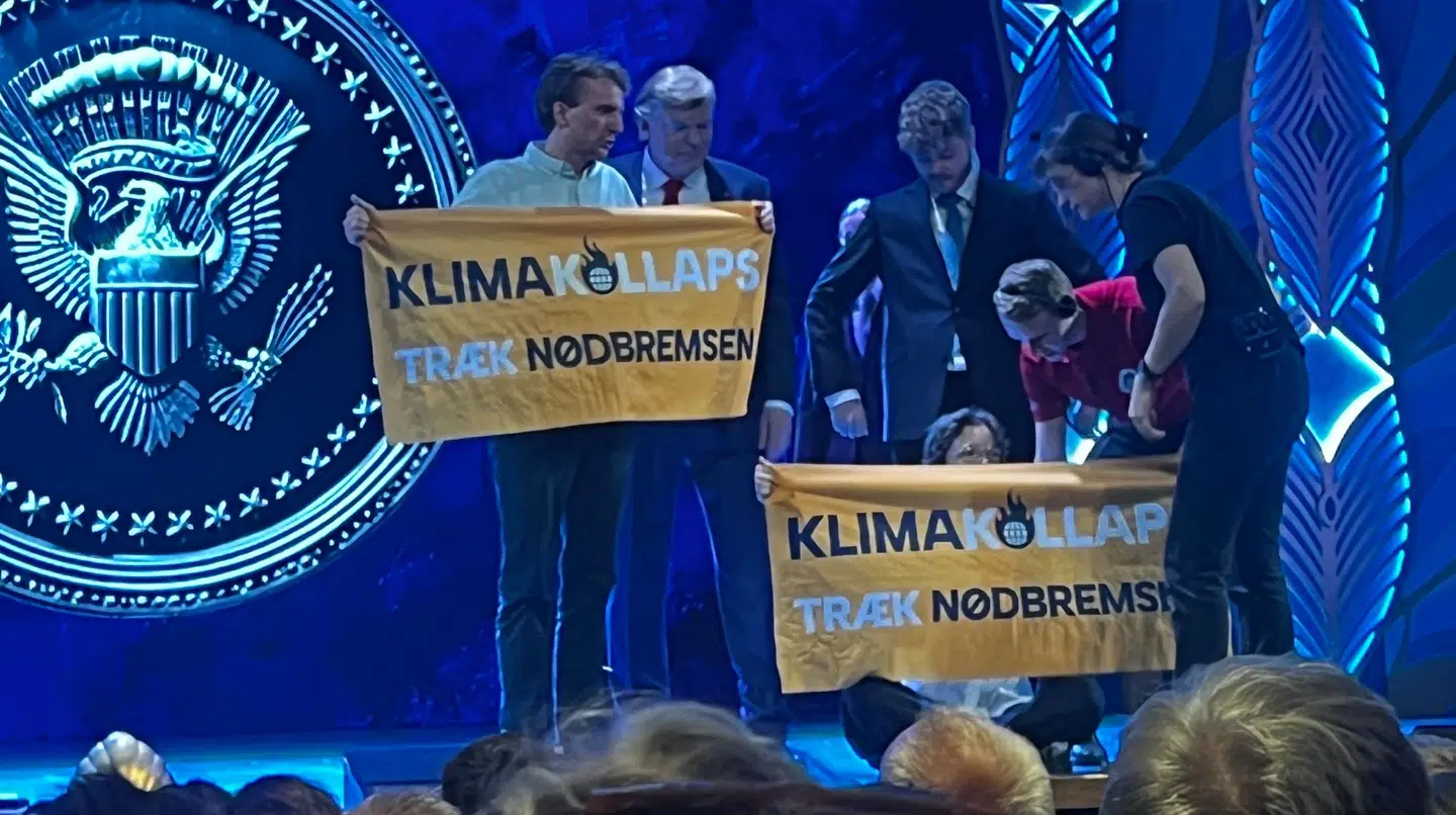 Niels Olsen og Henrik Lykkegaard var lige begyndt på anden halvdel af showet, hvor de optræder som Donald Trump og Joe Biden, da et par aktivister løb op på scenen med banner.