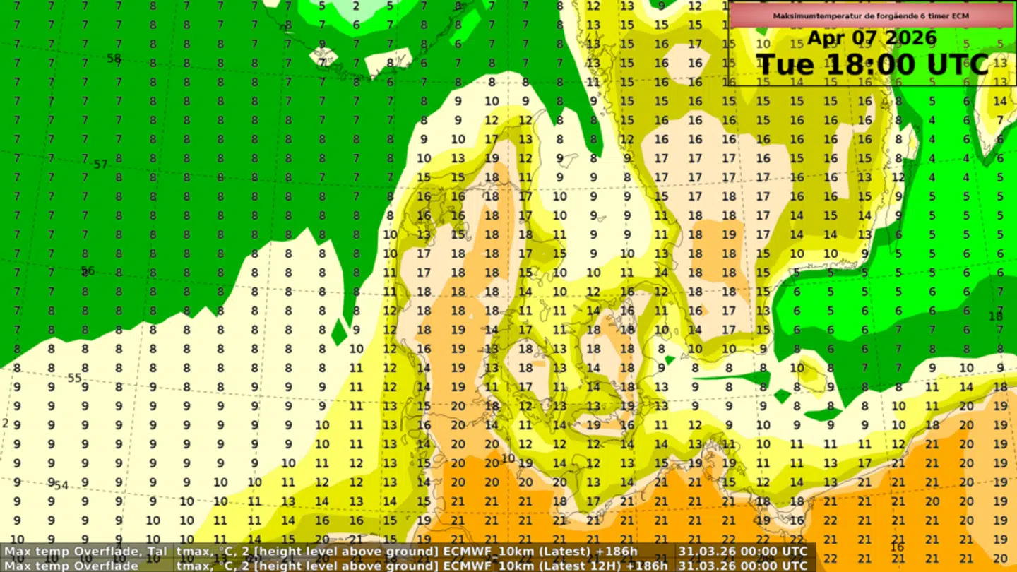 Her lyder det, at nogle prognoser sender varm luft op over Danmark sydfra, med en temperatur mellem 13 og 18 grader - lokalt måske 20 grader.