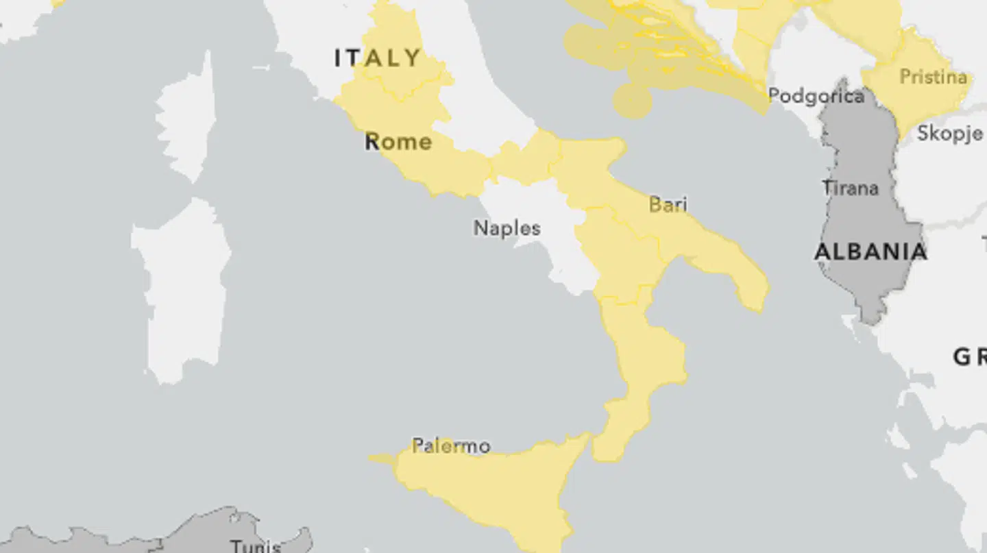 Det gælder hele området omkring Rom samt Bari og Sicilien.