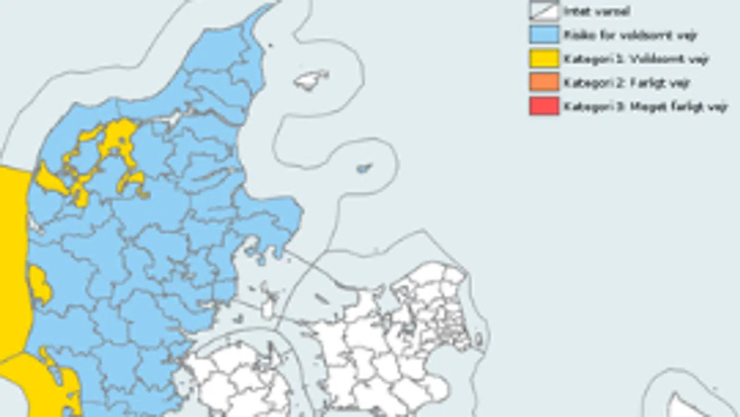 'Den kraftige vind resulterer i forhøjet vandstand i Vadehavet, langs Vestkysten og efterhånden også i Limfjorden. I forbindelse med højvandet søndag middag forventes vandstanden i Vadehavet at komme op mellem 2.4 og 3.0 m og langs Vestkysten op mellem 1.9 og 2.4 m,' skriver DMI.